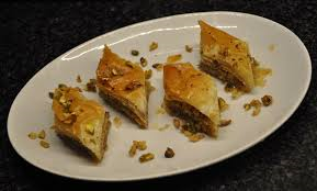 - Snijd de nog warme baklava in kleine driehoekjes en druppel er de siroop over.
