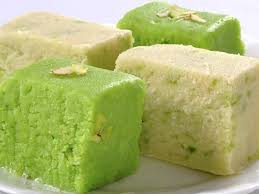 Doe de barfi over op een beboterde schaal. Als hij zover afgekoeld is dat u er iets mee kunt doen, vormt u hem tot een vierkante koek van ongeveer 2½ cm dikte, die u in stukjes kunt snijden als de barfi helemaal afgekoeld is.