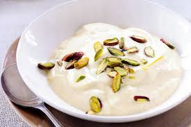 Hang de yoghurt in twee lagen kaasdoek boven een kom en laat hem 1 nacht uitlekken. Schraap de uitgelekte yoghurt dan in een kom. De yoghurt moet dik zijn en tot de helft van zijn oorspronkelijke volume zijn teruggebracht. Voeg de poedersuiker en saffraan toe. Klop de yoghurt met een garde. Als u saffraandraadjes gebruikt, laat ze dan eerst in wat rozenwater weken voordat u ze bij de yoghurt doet.