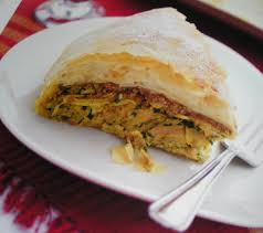 De ovenschaal insmeren met boter en bedek de bodem en zijkanten met het bladerdeeg. Doe de vulling hierin (zonder vocht) en bedek alles met bladerdeeg. Nu moet het nog in een voorverwarmde oven totdat de pastei goudbruin is.